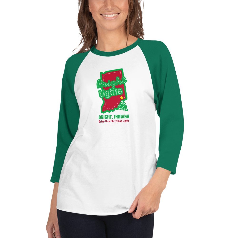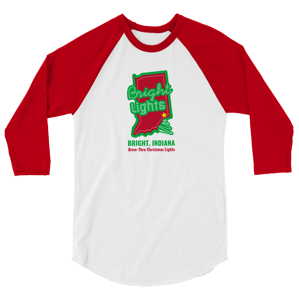 A stylish classic baseball raglan featuring the annual Christmas lights drive-thru in Bright, Indiana.